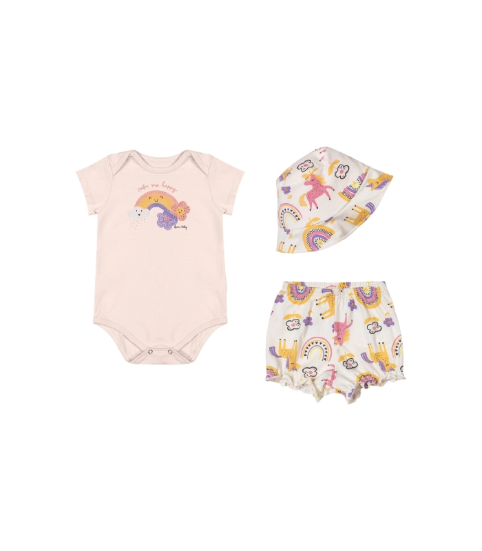 Conjunto bebe femenino 3 piezas, body , short y sombrero